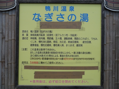 泉質:鴨川温泉(単純硫黄冷鉱泉)。掛け流しっぽい?